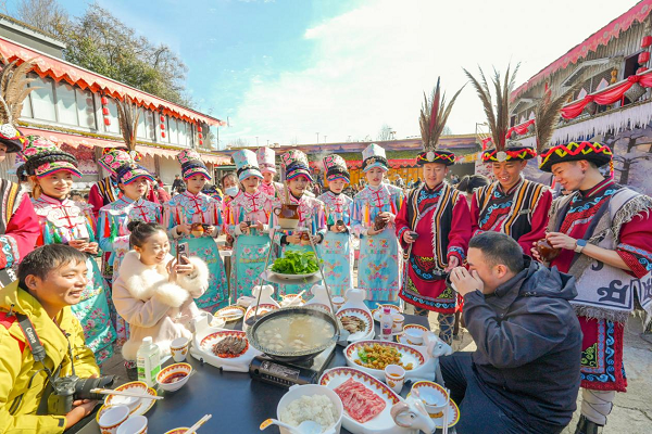 中午11时30分,活动开幕式在羌情园正式举行。身着传统服饰的羌族姑娘小伙手捧醇香咂酒,唱响祝酒歌,以地道的民族礼仪迎接宾客;随后的羌族婚礼展演,还原传统民俗流程,让游客沉浸式感受羌家儿女的浪漫风情。正午12时,刨汤宴开宴仪式震撼上演,羌家人身着盛装跳起丰收舞蹈,以灵动舞姿展现丰收喜悦、祈求风调雨顺。随后,腊腌香肠、暖心刨汤等8菜1汤特色羌家菜品陆续上桌,热气与香气弥漫全场,地道风味获游客广泛赞誉。席间,游客们举杯共庆羌年、碰杯声、欢笑声交织,热闹非凡。夜幕降临,萨朗篝火晚会接续狂欢,游客与羌族同胞围着篝火共舞,暖黄火光映照下,全场沉浸在欢乐祥和的氛围中。