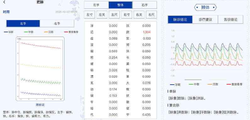 二是具备动态学习能力的中医辅助诊断平台。用户通过“知医APP”或“知医执业版中医辅助诊疗系统”连接脉象仪后,系统生成脉象图谱与结论(如弦滑脉、细数脉),并结合ChatiSS查体·智能辅助诊断系统进行辨证分析。该平台基于超万条病证方药数据训练,综合AI舌诊、AI把脉、AI问诊,可记录用户长期健康趋势,不断优化诊断建议。