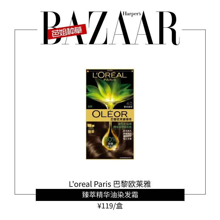 巴黎欧莱雅精华油染发霜,其霜状质地便于均匀上色,也有润发效果,有助于呈现发丝的亮泽质感。