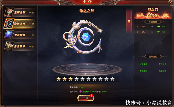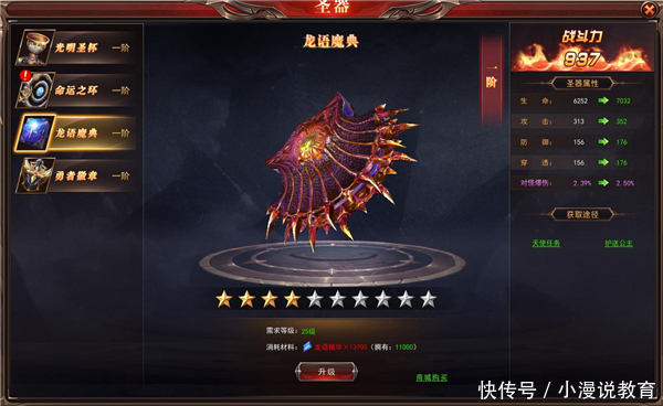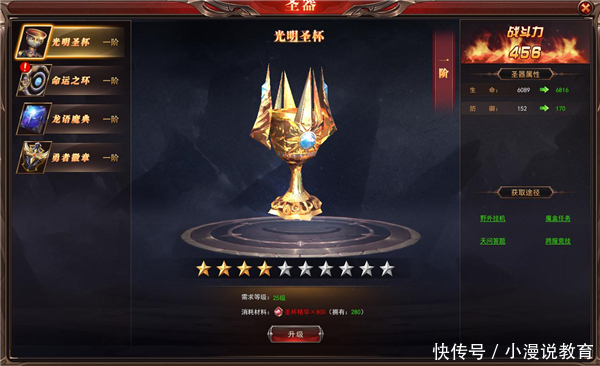 圣器可通过对应的精华升级,不同的圣器升级所需的精华来自不同的活动。圣器每一次升级成功都能获得更加可观的战斗力。